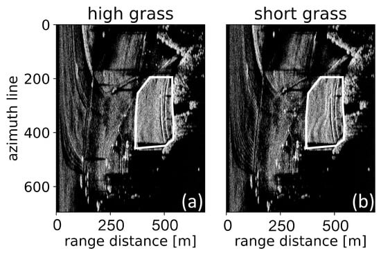 Measured MPI in the Hönggerberg test site with varying scattering properties. (a) high grass prevails in the near range (range distance less than 200 m) and only a small area has been mowed, while, in (b), the entire field in the near range has been mowed and the remaining short grass results in strong specular reflection. In the observation area (range distance 400–500 m), the MPI signal is much stronger when very short grass is exposed.