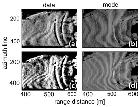 According to Equation (4), the MPI pattern frequency is proportional to the multipath baseline. To demonstrate this proportionality, we performed an experiment at the Hönggerberg test site, where data was acquired at different antenna elevations. Figure 8 shows the measured and modelled backscatter intensity images for the different antenna elevations. The upper row shows the results for an elevation of 1 m above the ground of the lowest antenna, the lower row for 2 m elevation. Both the measurement (on the left) and model (on the right) show a clear increase, corresponding to roughly a doubling in the MPI pattern frequency with a doubling of the multipath baseline. Thus, in the backscatter intensity data, a change in the multipath baseline manifests simply as a visible change in the MPI pattern frequency.
