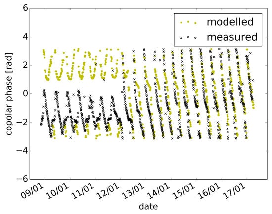 Time series of modelled and measured copolar phase variations induced by changes of the Davosersee lake surface level on a corner reflector.