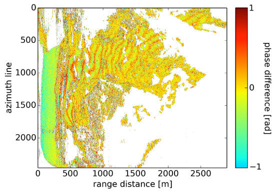 A similar problem arises when combining acquisitions separated temporally, if the reflective surface changes over time, such as was the case in the Davos test site. Over the course of the season, due to a reduction in the specular nature of the reflection, the MPI signal became almost indiscernible in the backscatter data, suggesting that multipath interference becomes negligible. However, especially at small interferometric baselines (here B = 36 cm), even the smallest phase errors in interferograms can lead to large errors in a DEM. We observed this in the difference of two single pass interferograms, separated by a timespan during which the lake surface dropped, but no other major changes occurred in the scene. Due to the change in lake level, the interference pattern in both interferograms is slightly shifted in space and frequency. In the interferogram difference, the interference pattern does therefore not cancel out and will instead exhibit clear phase undulations. An example for such phase undulations is shown in Figure 10, which is the difference of 10 averaged consecutive interferograms from midnight of 17 March and 18 March 2016 with corresponding lake surface elevations of 1538.2 and 1537.8. With a baseline of 36 cm, these phase variations correspond to deviations of several meters. On these dates, the MPI pattern was not easily visible in the intensity images. Nevertheless the undulations in the interferogram difference show that weak multipath interference can deteriorate or bias the data even if not visible at first sight in intensity images or single pass interferograms.