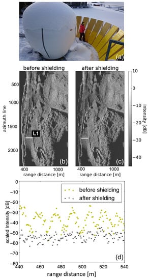 (a) photo of the shielding setup. The wooden scaffolding is covered with a fine-meshed (6 mm) aluminium grid; (b) backscatter intensity images before and (c) after shielding of the reflective surface. The MPI pattern is strongly reduced; (d) backscatter intensity along L1 averaged over 10 neighbouring azimuth lines before and after shielding; (a–d) illustrate the geometrical requirements for the occurrence of multipath interference.