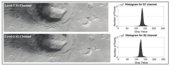 Figure 1. The illustration of the terrain characteristics of the Martian surface using the HRSC Level-2 images of orbit 5273. The default pixel data type of the High Resolution Stereo Camera (HRSC) Level-2 images is 16-bit integer, whereas the histograms only plot the valid values between 0 and 255. - (2)