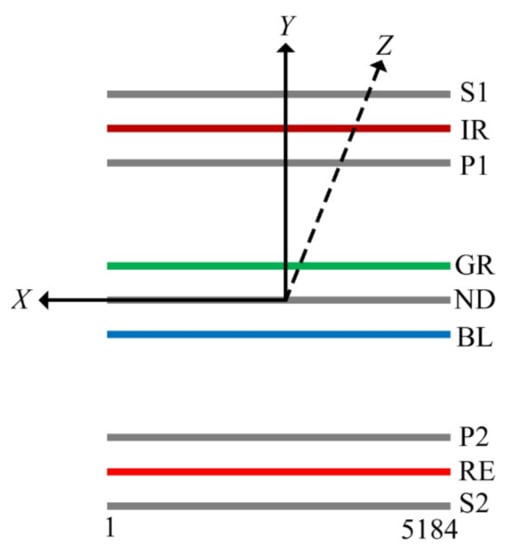 Focal plane arrangement of the High Resolution Stereo Camera (HRSC). S1, S2, P1, P2 and ND represent five panchromatic channels; IR represents near-infrared channel; RE, GR and BL represent red, green and blue channels respectively.