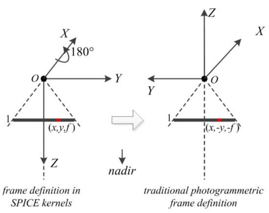 where “MEX_HRSC_HEAD” and “IAU_MARS” represents the MEX HRSC frame and body-fixed Martian Cartesian coordinate frame respectively, ET represents emphasis time and RM is used to store the rotation matrix between “MEX_HRSC_HEAD” and “IAU_MARS”. However, the frame definition acquired from SPICE kernels is different from the traditional photogrammetric frame definition. As observed in the left part of Figure 3, the Z axis of the MEX HRSC frame acquired from SPICE kernels points toward the Martian surface. In contrast, in the traditional photogrammetric frame, the Z axis points upwards. For ease of calculation, we convert the SPICE frame definition to the traditional photogrammetric frame definition by rotating 180 degrees around the X axis (See Figure 3). Consequently, the original image space coordinates are converted to .