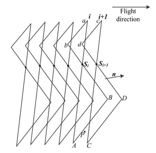 Figure 4 illustrates the basic principle of the fast back-projection algorithm. Suppose ab and cd are the image points of the two adjacent scan lines and , respectively, and are the corresponding ground points, and and are the corresponding exposure stations. The projection plane corresponding to scan line can be determined using the ground points , and This projection plane is referred to as . Firstly, we give the general plane equation in 3D object space.