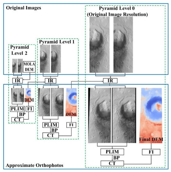 - The DEM is refined iteratively. At the lowest pyramid level, the approximate orthophotos are generated using a rough DEM (MOLA DEM) as reference data. The matched points on orthophotos are converted to the original Level-2 images. Then, the DEMs are generated through forward intersection. The DEM generated at the current pyramid level is used as a source of reference data to generate approximate orthophotos at the next pyramid level.