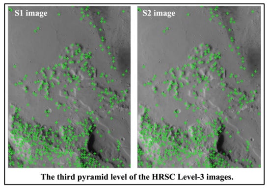 - Suppose that we start from the second pyramid level. Firstly, a rough MOLA DEM is used to perform image rectification, and two approximate orthophotos can be generated using the original HRSC Level-2 S1 and S2 images. Then, the pixel-level image matching is performed on approximate orthophotos instead of original images. The matched points on the approximate orthophotos are converted to the original images. Both image rectification and coordinate transformation of the matched points can use the fast back-projection algorithm described previously.