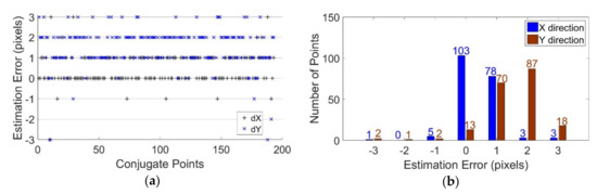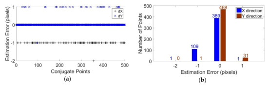 Estimation accuracy for approximate positions of conjugate points at the original image resolution level: (a) scatter chart; and (b) histogram chart.