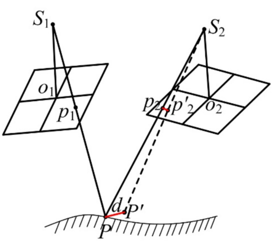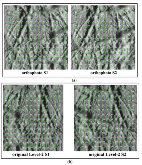 - The coordinates displacements of conjugate points on stereo approximate orthophotos are very small. Therefore, there is no need to perform epipolar resampling, and conjugate points can be determined with a small search range. This indicates that strong geometric constraints for image matching can be introduced implicitly by image rectification.
