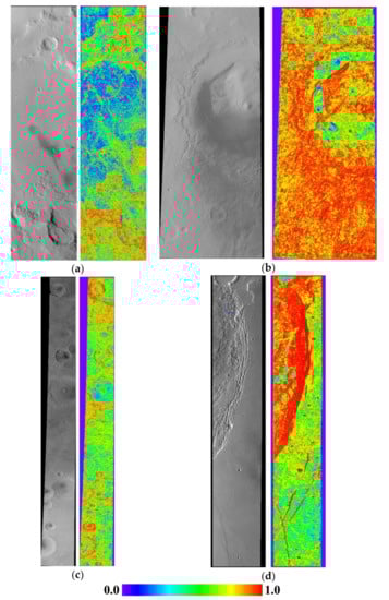 Figure 12 presents the image matching cost maps calculated using NCC for the test datasets. We use the S1 channel orthophoto as reference image. For each pixel on the S1 channel orthophoto, a NCC matching is carried out. Then, using the derived NCC matching results, the image matching cost maps can be plotted on the S1 channel orthophotos. As observed in Figure 12a, the regions with low image matching cost are mainly in flatland areas, which show poor image texture. However, the terrain relief information in flatland areas can be interpolated with a small number of conjugate points. Hence, the regions with low image matching cost will not affect the final DEM results. As noted in Figure 12b and the left top part of (d), very high image matching cost (near to 1.0) can be achieved at the rich texture areas such as craters and mountain areas. Consequently, surface reconstruction in these areas will deliver satisfying results.