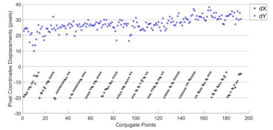 In order to discuss the estimation method for approximate positions of conjugate points, we performed image matching on the third pyramid level of the HRSC Level-3 images. Image matching was carried out between the S1 and S2 channels of orbit 4165. In order to deliver more reliable conjugate points to facilitate the discussion, a high NCC threshold of 0.9 was used. Figure 7 illustrates the matched points on the S1 and S2 channels. Figure 8 shows the PCDs of conjugate points. It is observed that most of the PCDs of conjugate points are less than two pixels in both the and direction. Hence, using the identical pixel coordinates on the left orthophoto as approximate positions, the conjugate point on the right orthophoto can be determined with a 5 × 5 search window. This indicates that at the third pyramid level of approximate orthophotos, the estimation accuracy for approximate positions of conjugate points can reach two pixels. Therefore, conjugate points can be determined efficiently and accurately. Considering that the image resolution of the third pyramid level is eight times lower than the original image resolution, it can be inferred that the maximum PCDs of conjugate points will reach 16 pixels at the original image resolution level. As we noted previously, the HRSC Level-3 images are generated through image rectification using MOLA DEMs. Thus, when the refined DEM is used to generate approximate orthophotos at the higher image resolution level, the PCDs of conjugate points will be decreased further.