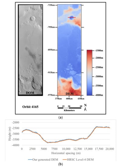 DEM results and terrain profiles comparison for orbit 4165: (a) digital orthophoto map (DOM) and DEM results; and (b) terrain profiles comparison between the generated DEM and the HRSC Level-4 DEM.
