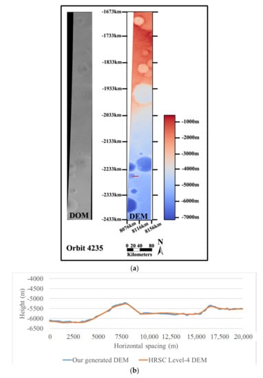 DEM results and terrain profiles comparison for orbit 4235: (a) DOM and DEM results; and (b) Terrain profile comparison between the generated DEM and the HRSC Level-4 DEM.