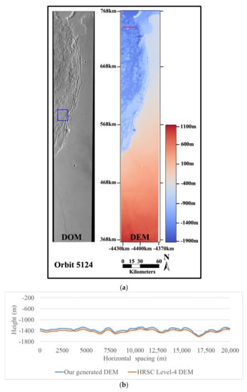 DEM results and terrain profiles comparison for orbit 5124: (a) DOM and DEM results; and (b) Terrain profile comparison between the generated DEM and the HRSC Level-4 DEM.