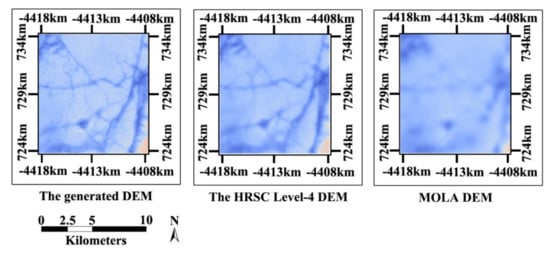 In order to further present the pixel-level image matching results, visual comparison among the generated DEM, HRSC Level-4 DEM, and MOLA DEM was performed. The HRSC Level-4 DEM and MOLA DEM are resampled with a grid spacing of 25 m, which is the same as the grid spacing of the generated DEM. The comparison region is marked with a blue rectangle in Figure 19a. The results are presented in Figure 20. As can be observed, the generated DEM shows more terrain relief details. Meanwhile, the generated DEM also shows some noise, which is mainly caused by some inaccurate conjugate points.
