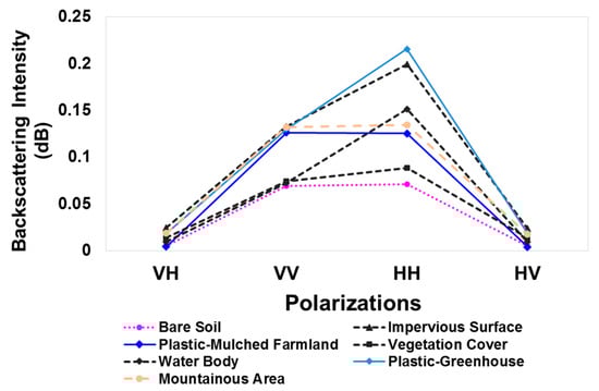 The mean values of the backscattering coefficient of different polarization were extracted from preprocessed images (Figure 4 for Jizhou and Figure 5 for Guyuan). In Figure 4, it can be seen that the backscattering intensities of PMF and bare soil in Jizhou were very similar. In particular, the mean values of the cross-polarization (HV, VH) were substantially overlapped with each other. This situation on the cross-polarization (VH, HV) was slightly better than co-polarization (HH, VV), but the separation was still poor. However, the separability between PMF and the impervious surface was better. In Figure 5, it can be seen that the backscattering intensity of PMF in Guyuan on cross-polarization (VH, HV) was poorly separated from other land cover types. Additionally, the separation on the co-polarization (HH, VV) was better than cross-polarization, while the separation on HH was better than VV polarization.