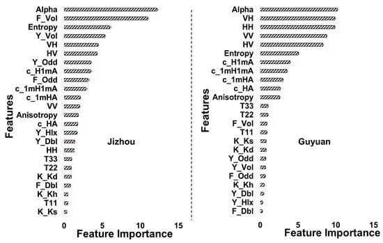 Analysis of feature importance (Figure 6) suggested that the descriptors derived from the H/A/Alpha decomposition were the most important features for mapping PMF. Additionally, the descriptors generated from the Yamaguchi4 and the Freeman decomposition were found to be the next most important features, while the contribution of Krogager decomposition descriptors was the smallest. The importance order of Radarsat-2 features for mapping PMF in Jizhou was ranked as Alpha, entropy, VH, HV, C_1mH1mA, C_H1mA, C_1mHA, C_HA, Y_Odd and anisotropy. Additionally, that in Guyuan was ranked as Alpha, VH, HH, VV, HV, entropy, C_H1mA, C_1mH1mA, C_1mHA, C_HA, and so on.
