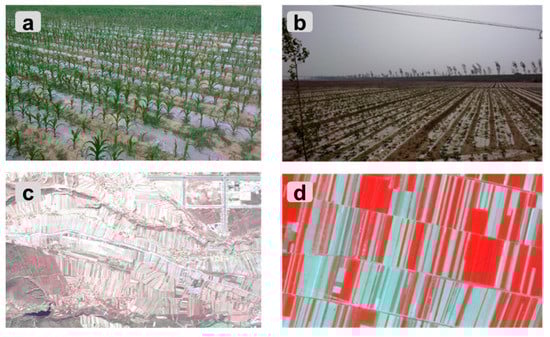 The photo and GF-1 image showing PMF in Jizhou and Guyuan: (a) field photo of PMF in Guyuan; (b) field photo of PMF in Jizhou; (c) GF-1 image of PMF in Guyuan; (d) GF-1 image of PMF in Jizhou; two GF-1 images are displayed in false color composite (R: NIR, G: red, B: green).
