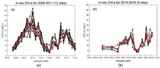 (a) In situ Chl-a measurements for each of the sampling site shown in black for 2009–2010, imposed red line is the mean for all sites (b) The same as (a), but for 2014–2016.