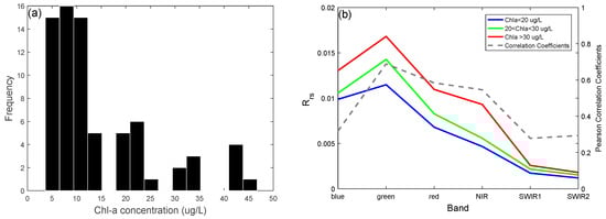 (a) The histogram of all in situ Chl-a measurements that have matched Landsat imagery within five days; (b) The mean remote sensing reflectance for different Chl-a concentration categories and the Pearson correlation coefficients between ln(Chl-a) and remote sensing reflectance.
