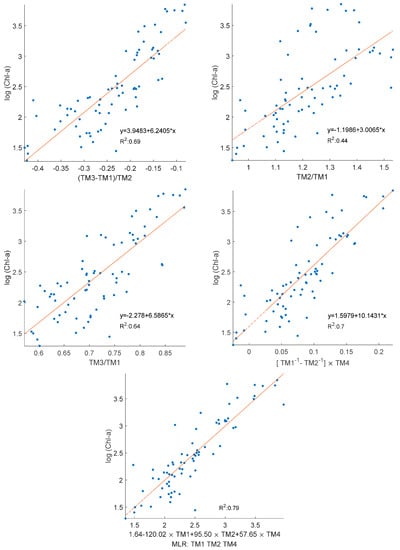 The first objective of this study is to develop a single equation using Landsat reflectance that have matched ground data by linear regression and use this equation on all archived images for Erhai Lake. Thus, empirical models are used, while complex algorithms like machine learning, relevance vector machines are avoided []. Various band combinations are explored and the estimated Chl-a are compared with in situ Chl-a data. The model with the highest closeness of fit is selected. Natural log-transformed Chl-a observations is used because the relationship between band combinations values and log(Chl-a) were shown to be approximately linear over a broad range of Chl-a []. The five most effective algorithms for the study area are listed in Table 4. They all use Landsat band 1 to 4. Algorithm #1 to #4 are based on band arithmetic and band ratios. According to [], (TM1 − TM3)/TM2 and TM2/TM1 are recommended for low Chl-a concentration situations (<20 μg/L), while TM3/TM1 is recommended for high Chl-a concentration situations (>20 μg/L). Algorithms #4 (TM1−1 − TM2−1) × TM4 is inspired by the classical three-band model, which is originally designed to estimate pigment contents in terrestrial vegetation, and has been proved to be very effective for Chl-a concentration retrieval []. The three-band model uses two reciprocal reflectance where λ1 is the wavelength of the band maximally sensitive to Chl-a absorption while λ2 is the wavelength of the band minimally sensitive to Chl-a absorption. Additionally, λ3 is the wavelength of the band minimally affected by absorption that accounts for scattering. Multivariate linear regression (MLR) has also been considered [,]. Several MLR combination were explored through stepwise procedures for our data, and the combination of TM1, TM2 and TM4 is the most effective.