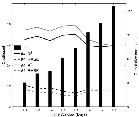 Relationship between the width of the time window between satellite and ground observations and the number of samples (n), R2, and RMSE for algorithm #4 and #5.