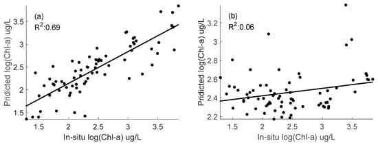 Calibration and validation of algorithms #4 and #5 are conducted as described in Section 3.3. The model predicted values for each sample point produced by the leave one out cross validation procedure is used in a linear regression with the in situ measurements of Chl-a concentrations (Figure 6). The RMSECV for algorithms #4 and #5 are 0.37 and 0.64, while the R2 for algorithms #4 and #5 are 0.69 and 0.06, showing that algorithm #4 performs better than algorithm #5. As MLR suffers from the problem of overfitting, algorithm #4 is selected as the final model for modeling Chl-a concentrations. Using a total sample number of 73 for a time window of ±5 day, the model is defined in Equation (2):