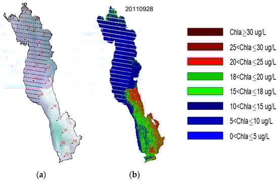 (a) The 21 actual data points collected during 10–12 September 2011 are shown with the true-color composite Landsat 7 image acquired on 28 September 2011; (b) The Chl-a concentration map for 28 September 2011 derived using our selected model. The parallel lines on the maps are areas affected by the Landsat 7 scan line error.
