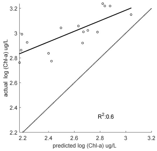Predicted and actual log (Chl-a). The 1:1 line is represented by the dashed line, while the solid line represents the observed relationship between the satellite estimated values and actual measured values (n = 16, R2 = 0.60, RMSE = 0.44 μg/L, RRMSE = 16%).