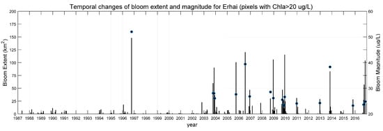 Temporal changes of bloom extent, defined as the area with Chl-a larger than 20 μg/L from 1987 to 2016. The bloom magnitude, which is the mean Chl-a for days with a bloom extent larger than 25 km2, are shown as dots.
