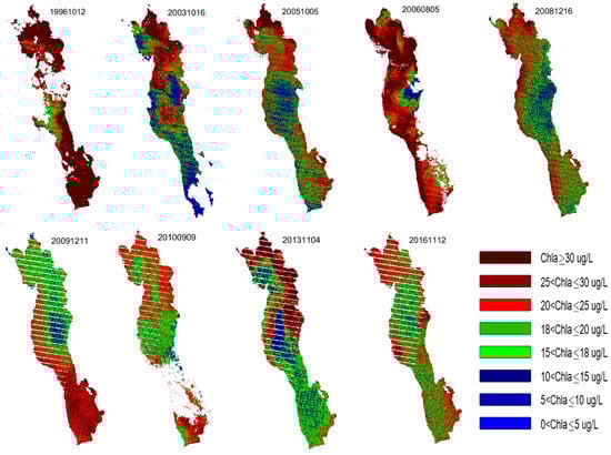 As shown in Figure 10, high Chl-a concentrations most frequently occur on the southern and northern part of the lake, as 60% of the water of Erhai Lake comes from the two main inflows at the northern tip []. These two inflows are the sources of pollution for Erhai Lake. The nutrients input from runoff causes the high Chl-a concentration in the northern part of the lake. On the other hand, waste water with nutrients is discharged into Erhai Lake from Dali city located on the southwest shore of Erhai Lake. Thus, Chl-a concentrations are high in the northern and southern part of the lake.