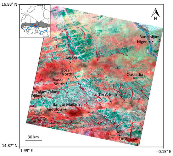 - Mougin, E.; Hiernaux, P.; Kergoat, L.; Grippa, M.; de Rosnay, P.; Timouk, F.; Le Dantec, V.; Demarez, V.; Lavenu, F.; Arjounin, M.; et al. The AMMA-CATCH Gourma observatory site in Mali: Relating climatic variations to changes in vegetation, surface hydrology, fluxes and natural resources. J. Hydrol. 2009, 375, 14–33. [Google Scholar] [CrossRef]