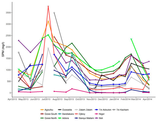 - Pinet, S.; Martinez, J.M.; Gosset, C.; Grippa, M.; Robert, E.; Ouillon, S.; Kergoat, L. Monitoring of suspended particulate matter concentration using sentinel-2, landsat-8 and spot-5 data over highly turbid waters in a West African reservoir. In preparation.