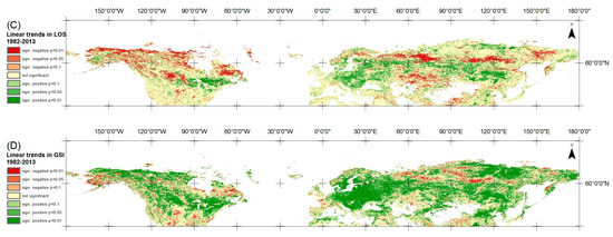 The calculated trends in LOS, including SOS and EOS (Figure 2A–C), are consistent with the spatial patterns of phenological trends in Zhao et al. [52], who extracted vegetation phenological changes above 40°N of the NH during 1982–2013 from GIMMS3g NDVI data. They also employed the TIMESAT approach, but with different parameter settings as compared to this study, indicating the robustness of the method for phenology retrieval and consequently the results obtained in this study. Moreover, the calculated trends in GSI (Figure 2D) are in agreement with the result from Fensholt et al. [53], although their study period (1982–2011) was two years shorter than this study.