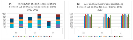 Biomes having the lowest percentages of pixels with significant positive correlation between LOS and GSI (Figure 6B) are mainly observed for non-forest biomes for the NH and NA (shrublands and grasslands for EA), whereas forest biomes and croplands show the highest percentages for the NH, NA, and EA. On the contrary, biomes having the highest percentages of pixels with significant negative correlation between LOS and GSI are primarily found in non-forest biomes for the NH and NA, whereas forest biomes and croplands show the lowest percentages.
