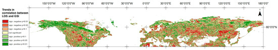 This study shows widespread changes in the strength of correlations between LOS and GSI (70.90% of the study area) during the past three decades in the NH (Figure 7). Regions that are covered by significant positive correlation between LOS and GSI are becoming more dominant over time, as compared to areas of decreasing correlations. However, by comparing Figure 5 and Figure 7, it can be observed that grasslands in the mid-latitude arid/semi-arid areas with low/negative correlations (e.g., central NA, central Asia, Mongolia, and north China) show significant decreasing strength in the correlation between LOS and GSI, whereas high-latitude tundra regions with low/negative correlations (e.g., arctic area of NA and EA) exhibit a significant increasing correlation. Since both regions are less affected by direct human influence, this difference may reflect latitude- and/or biome-dependent changes in ecosystem functioning in response to long-term climate change or climate extremes/natural disturbance. In contrast to significant changes in these non-forest biomes, both positive/negative trends in correlations between LOS and GSI are rarely found in forest biomes (Figure 8A). This is also confirmed by Chen et al. [77] who revealed non-significant correlation between LOS and plant productivity in most of southern Canadian Arctic tundra and further suggests biome-specific changes in long-term correlations between LOS and GSI.