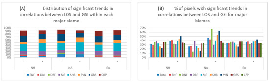 Pixels with significant positive trends in correlations between LOS and GSI (Figure 8A) are mainly distributed in croplands and non-forest biomes for the NH, but are rarely found in forest biomes, except for mixed forest. Interestingly, a similar distribution pattern is observed for pixels with negative trends. Biomes having high percentages of pixels with significant positive trends in correlations between LOS and GSI (Figure 8B) are mainly observed for savannas, shrublands, evergreen needleaf forest, and mixed forest for the NH, whereas low percentages of these trends are primarily found for deciduous broadleaf and needleleaf forest, croplands, and grasslands. Complementarily, biomes having high percentages of pixels with significant negative trends in correlations between LOS and GSI (Figure 8B) are mostly observed for deciduous broadleaf and needleleaf forest, croplands, and grasslands, while low percentages of these trends are mainly found for savannas, shrublands, evergreen needleleaf forest, and mixed forest.