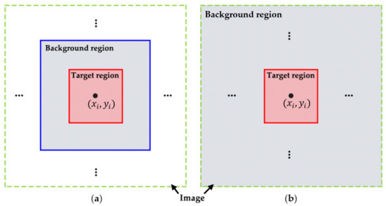 In general, nonsalient pixels in homogeneous background areas are likely to be similar at different scales. In contrast, salient pixels in heterogeneous and complex areas could behave similarly at a few scales, but not at all of them. Therefore, multiple scales can be incorporated to further decrease the saliency of background pixels, thus improving the contrast between salient and nonsalient regions. From the perspective of target detection, the choice of local region size is related to the target size [21,22,23]. Specifically, when the target region and local region are a similar size, it will be beneficial for the detection. Nevertheless, when the local region size is much larger or smaller than the size of the target, there will be some false alarms or omissions in the detection result. Thus, in this paper, we change the local region size, i.e., the heterogeneous target region in Figure 1, to conduct the saliency map generation at multiple scales, where the size of the target region is usually changed from 3 × 3 to n × n depending on the size of the largest potential target and the image resolution. The size of the background region in Figure 1a can be chosen as 3~7 times of the target region size. For the background region in Figure 1b, it remains unchanged.