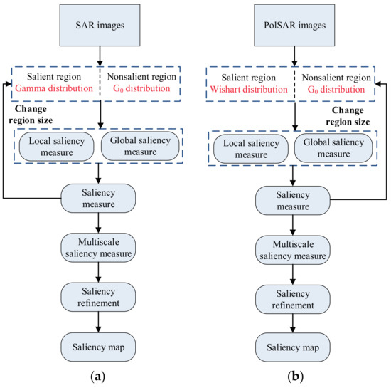 The whole flowchart of our proposed saliency map generation approach for SAR and PolSAR images is shown in Figure 2, where Figure 2a is the procedure for SAR images, and Figure 2b is the procedure for PolSAR images. From this flowchart, we can find that the processing steps for SAR and PolSAR images are the same, and the only difference is the corresponding PDFs of the salient and nonsalient areas.