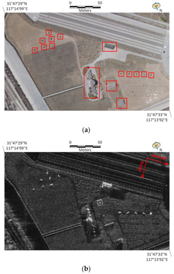 First study area and single-polarization SAR dataset with X-band. (a) Optical image from Google Earth. The red rectangles denote salient regions through human visual perception; (b) HH polarization SAR image with X-band.