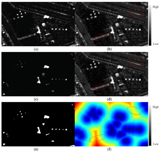 Figure 5d depicts the multiscale saliency map before the refinement. Compared with the saliency maps with single scale in Figure 5a–c, we can find that the multiscale processing can enhance the saliency of man-made targets. Meanwhile, the saliency of the background can be suppressed to some extent. This good performance benefits from the settings of different target region sizes, which can capture the saliency of targets with various sizes. However, we can still find some false alarms, such as the areas marked with the red ellipses, which can be further suppressed by the following refinement stage. Figure 5e gives the focus of attention regions, namely the potential targets. The distance map is shown in Figure 5f. It can be found that the pixels surrounding the focus of attention points have quite low distance values. In contrast, the roads and trees that are far away from the focus of attention points have high distance values, as shown in the red elliptic areas. According to the refinement in Equation (15), the saliency of the pixels that are far away from the focus of attention points can be further suppressed, which can be observed from the comparison between Figure 4a and Figure 5f.