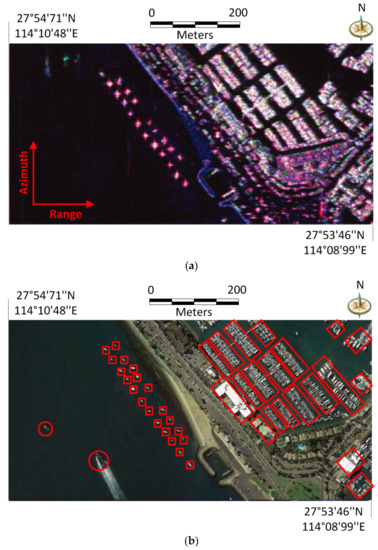 The second PolSAR dataset is acquired by the UAVSAR L-band imaging system. The study area is a harbor located in the southern California coast of the United States, as shown in Figure 10b. This area covers open water, some buildings, isolated boats, and man-made grounds, which is a complex image scene. Figure 10a displays the full polarimetric SAR image with Pauli-color coding, where the rows denote the azimuth direction and the columns represent the range direction. The multilook complex data have a resolution with 7.2 m in the azimuth direction and 5 m in the range direction. From the perspective of human visual perception, the boats and buildings are of interest, and should be regarded as salient objects, which are marked with red rectangles in Figure 10b. Due to the relatively low resolution, the vehicles on the road are too small to be regarded as salient objects. Note that there are two ships in Figure 10b, but they disappear in Figure 10a, as depicted in the two red circles. It is worth pointing out that the optical image is acquired from Google Earth, which has a different date than that of the PolSAR image; therefore, the two ships may move out of this place. They are ignored in the following comparison analysis.