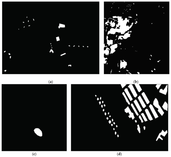 Human-annotated ground truth of salient target detection. (a) X-band SAR image; (b) Sentinel-1 C-band SAR image; (c) Radarsat-2 C-band PolSAR image; (d) UAVSAR L-band PolSAR image.
