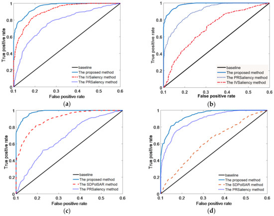 Receiver operating characteristic (ROC) curves of various methods using different datasets. (a) X-band SAR image; (b) Sentinel-1 C-band SAR image; (c) Radarsat-2 C-band PolSAR image; (d) UAVSAR L-band PolSAR image.