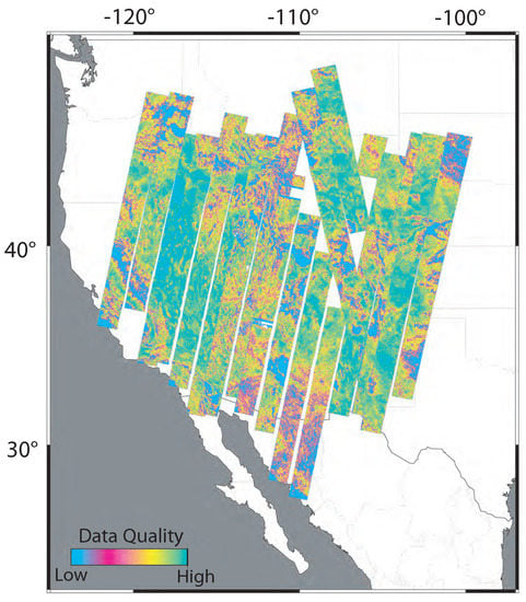For our processing in the western USA, we delimited the northern, western, southern, and eastern boundaries of the region to be studied by producing test interferograms for those areas to assess data quality and evaluating the distribution of available C-band data. In Figure 1, we show a measure of data quality for individual interferograms (as calculated in ROI_PAC software for use as a mask for phase unwrapping that scales phase variance as a unitless value between 0 and 1) for the three C-band satellites in the western USA. Values close to 1 indicate good data quality (little change between the time of SAR acquisitions). The interferograms shown in Figure 1 span a range of time intervals (9 months to 2 years) and include data acquired in different seasons, but the general patterns are representative of the spatial variations in data quality. Specifically, the coherence and InSAR data quality are lower in the areas with high topographic relief and/or seasonal snow cover (like the Sierra Nevada and Rocky Mountains) and at the northernmost and southernmost latitudes of the study area, likely because of changes in vegetation and precipitation.