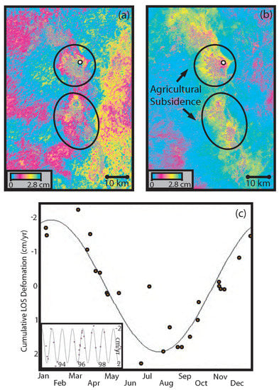 Unwrapped Envisat interferogram spanning 21 May 2005 to 8 August 2009, showing time series from two areas of LOS decrease (interpreted as uplift—(a,b)) and their locations in (c). The area with no information in the center of the uplifting zone corresponds to agricultural fields that are decorrelated.