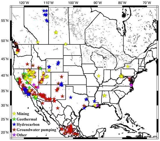 Human activity, such as mining, extraction of ground water and hydrocarbons, injection of fluid to enhance secondary recovery of hydrocarbons or dispose of wastewater, and utilization of geothermal fields, can cause displacements of the Earth’s surface that scientists can measure from space (e.g., [,]). This anthropogenic deformation is important to quantify for several reasons—(1) it can present a hazard to infrastructure (e.g., [,]); (2) it contaminates precise measurements of other types of deformation (e.g., magmatic, tectonic, or glacial isostatic adjustment; [,,,,]); (3) the Earth’s response to known pumping, surface change, or mining activity can provide otherwise inaccessible information about the subsurface (e.g., [,]); and (4) when there is damage, discriminating anthropogenic and natural deformation can have implications for liability—for example deformation (particularly subsidence) can exacerbate natural hazards like flooding and sea level rise (e.g., [,]). While individual sites in North America have been examined in detail (e.g., [,,,,,,,,]), we lack a continental-scale, synoptic view of anthropogenic deformation and its significance, including characterization of how well we can observe it when it exists, i.e., the detection threshold for signals with a range of scales and environments.