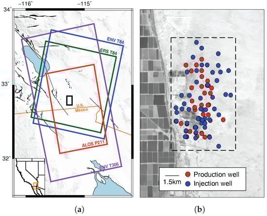 (a) Geographic setting of the East Mesa Geothermal Field (EMGF) study region and data coverage. Colored boxes indicate the extent of InSAR data used (Table 1) in this study, and solid black lines are Holocene faults. The black box indicates the area shown in (b) which shows the locations of currently active production and injection wells at the EMGF. The dashed black box is the reference box for Figure 7 and Figure 8.