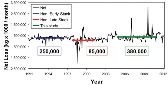 Net loss of water (production minus injection) at the EMGF from January 1990 to January 2012 as reported to the California Department of Conservation. Solid blue and red lines show the average net loss during two time periods during the ERS track 84 time series used by Han et al. [], and the green line is the average net loss during Envisat track 84.