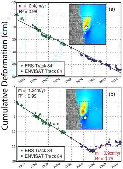 Cumulative LOS displacement showing maximum subsidence (a) and uplift (b) at East Mesa for the combined ERS and Envisat track 84 time series taken from the two locations shown by the white circles in the respective inset maps (see Figure 7b for scale). We assumed the deformation rate was constant during the interval between ERS and Envisat.